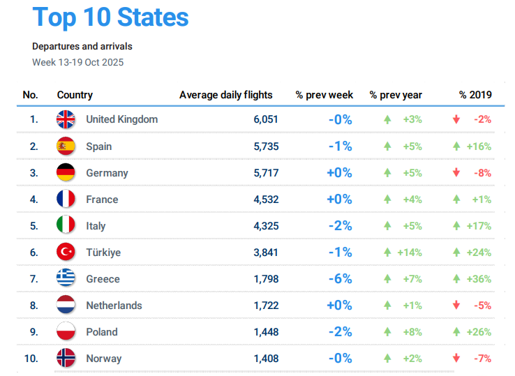 EUROCONTROL tarafından, 23 Ekim 2025 tarihinde yayımlanan Avrupa Havacılık Genel Bakış Raporu’nda yer alan “13-19 Ekim 2025” dönemi hava trafik istatistiklerine göre;