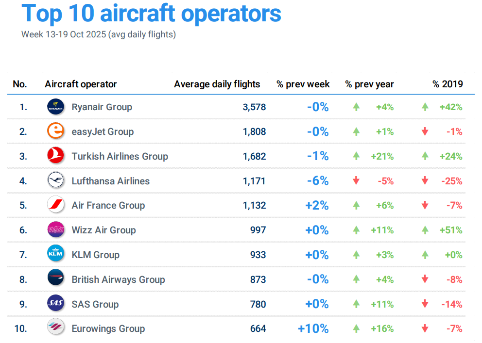 2025 Yılı 13-19 Ekim döneminde, Avrupa’da en fazla uçuş gerçekleştiren 10 Havayolu İşletmesi arasında;