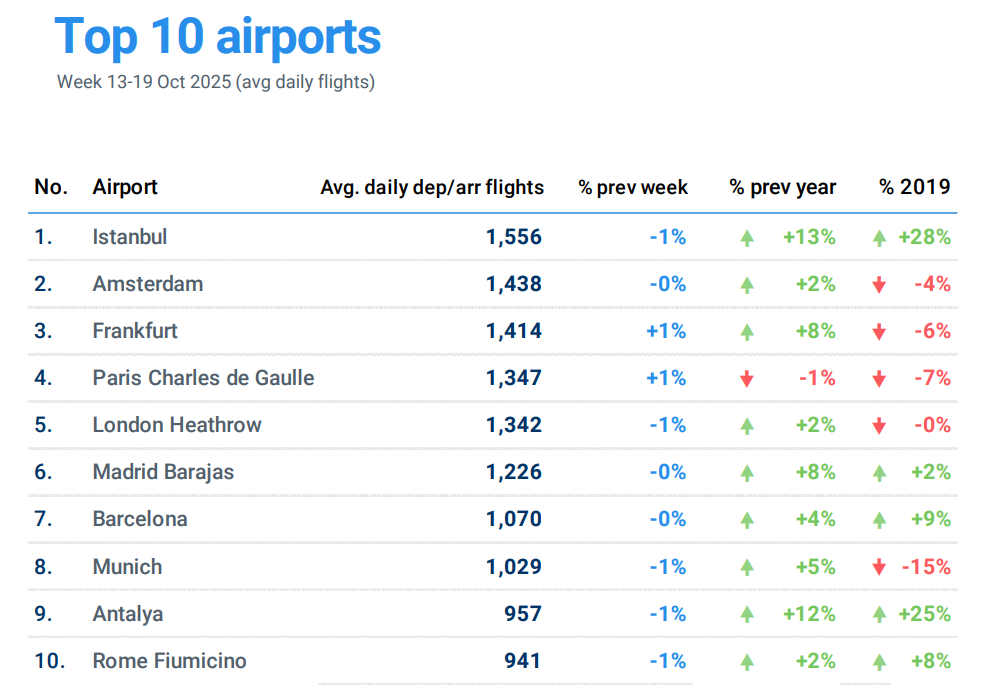 2025 Yılı 13-19 Ekim döneminde, Avrupa’daki en yoğun havalimanları arasında;