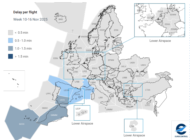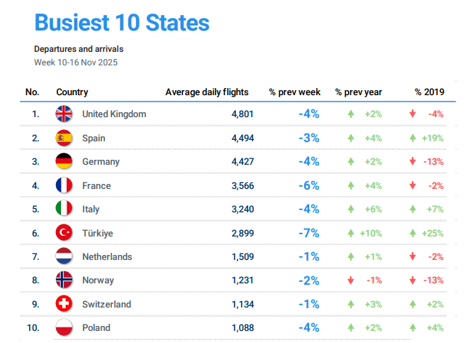 EUROCONTROL tarafından, 20 Kasım 2025 tarihinde yayımlanan Avrupa Havacılık Genel Bakış Raporu’nda yer alan “10-16 Kasım 2025” dönemi hava trafik istatistiklerine göre;