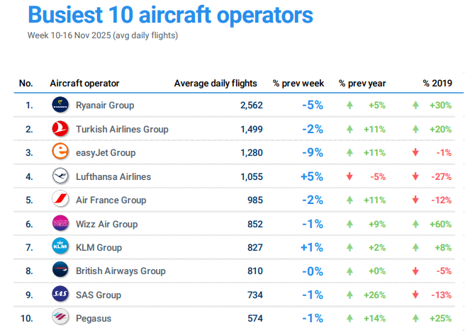 2025 Yılı 10-16 Kasım döneminde, Avrupa’da en fazla uçuş gerçekleştiren 10 Havayolu İşletmesi arasında;