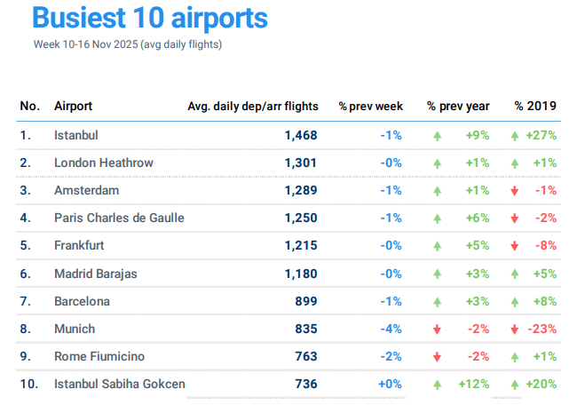 2025 Yılı 10-16 Ekim döneminde, Avrupa’daki en yoğun havalimanları arasında;
