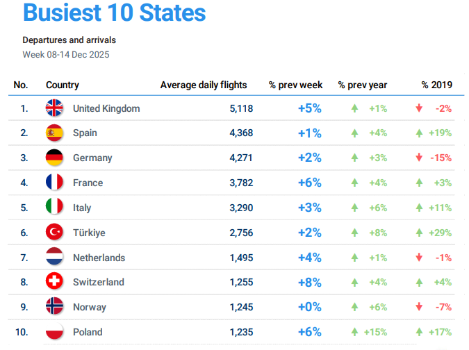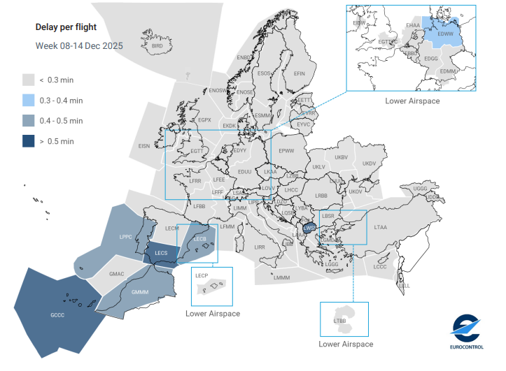 EUROCONTROL tarafından,  18 Aralık 2025 tarihinde yayımlanan Avrupa Havacılık Genel Bakış Raporu’nda yer alan “8-14 Aralık 2025” dönemi hava trafik istatistiklerine göre;