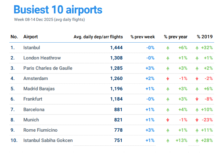 2025 Yılı 8-14 Aralık döneminde, Avrupa’daki en yoğun havalimanları arasında;